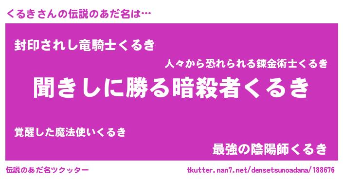 | 男性向けラノベタイトル風あだ名 | 『クルキスレイヤー』『緋弾のクルキ』 |