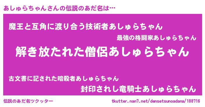 | 意味不明あだ名 | 『とにかく怪しいあしゅらちゃん』 |