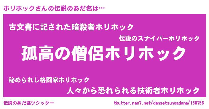 | 男性向けラノベタイトル風あだ名 | 『魔弾の王とホリホック』 |