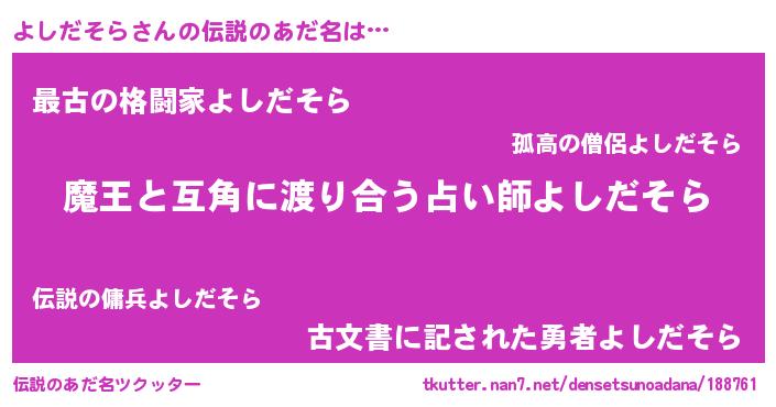 | ヒーロー風カッコイイあだ名 | 『愛の使者よしだそら』『ネオヨシダソラ』 |