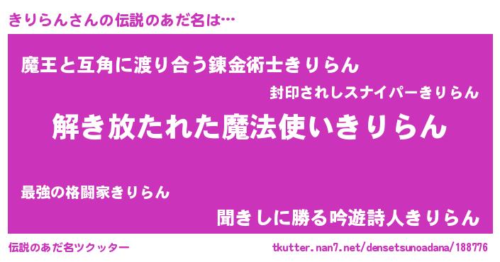 | 男性向けラノベタイトル風あだ名 | 『転生したらきりらんだった件』 |