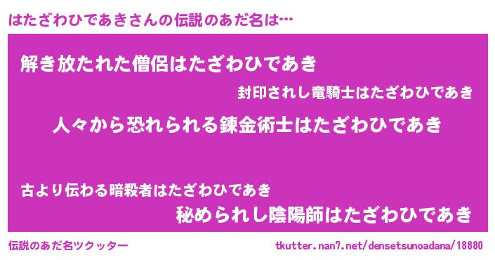 | 意味不明あだ名 | 『自称はたざわひであき』 |