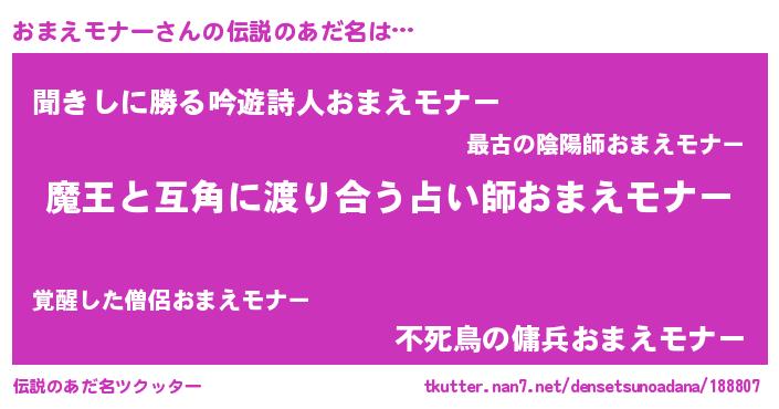 | 男性向けラノベタイトル風あだ名 | 『この素晴らしい世界におまえモナーを!』 |