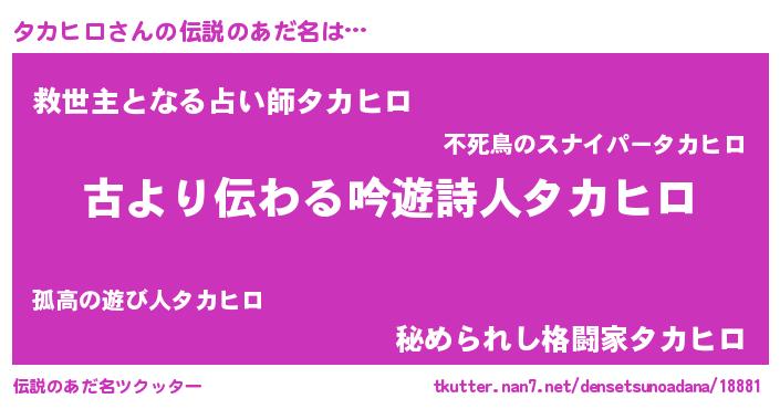 | 意味不明あだ名 | 『なめこ科タカヒロ属』『自称タカヒロ』 |
