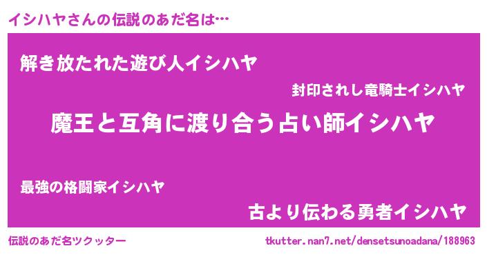 | ヒーロー風カッコイイあだ名 | 『仮面イシダー』『慈愛の使者イシハヤ』 |