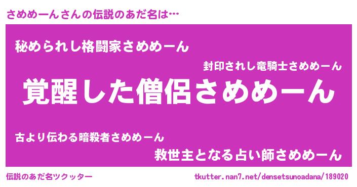 | 男性向けラノベタイトル風あだ名 | 『さめめーんの嫁は女の子じゃないと思った?』 |