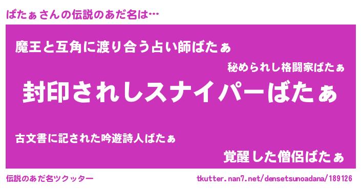 | 胡散臭い通販商品みたいなあだ名 | 『億万長者になれる霊験あらたかなお札…その名も「ばたぁ」』 |