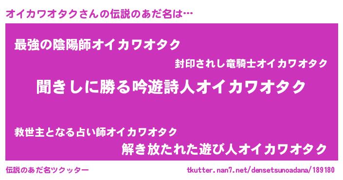 | 男性向けラノベタイトル風あだ名 | 『オイカワオタクという概念が存在しない退屈な世界 』 |