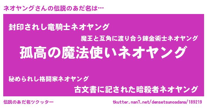 | 胡散臭い通販商品みたいなあだ名 | 『信頼と実績のサプリメント…その名も「ネオヤング」』 |