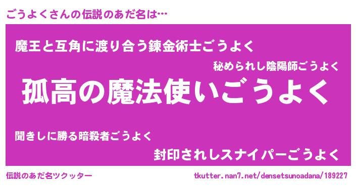 | 胡散臭い通販商品みたいなあだ名 | 『信頼と実績のサプリメント…その名も「ごうよく」』 |