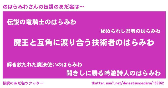 | ヒーロー風カッコイイあだ名 | 『慈愛の使者のはらみわ』『仮面ノハダー』 |