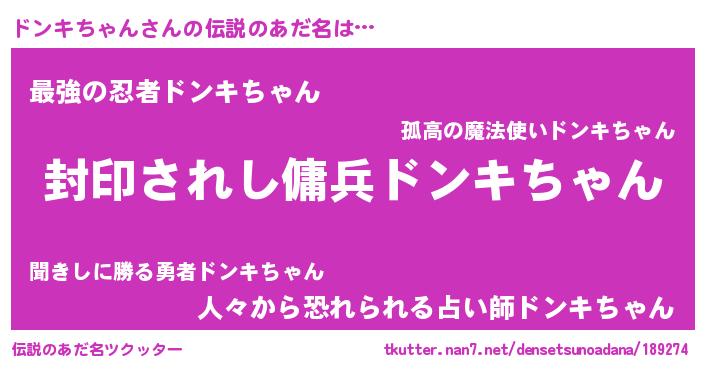 | 男性向けラノベタイトル風あだ名 | 『ドンキちゃんに滅ぼされるだけの簡単なお仕事です』 |
