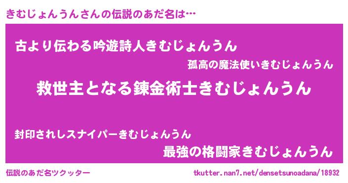 | 男性向けラノベタイトル風あだ名 | 『きむじょんうんに滅ぼされるだけの簡単なお仕事です』 |