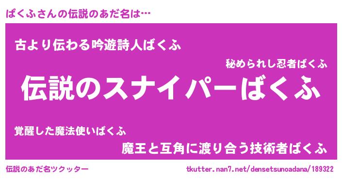 | 男性向けラノベタイトル風あだ名 | 『魔弾の王とばくふ』『ばくふの憂鬱』 |