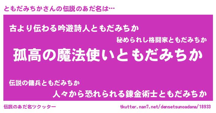 | 胡散臭い通販商品みたいなあだ名 | 『信頼と実績のサプリメント…その名も「ともだみちか」』 |