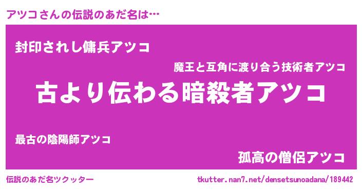 | 女子向けラノベタイトル風あだ名 | 『闇のアツコ』『アツコの契約王妃』 |