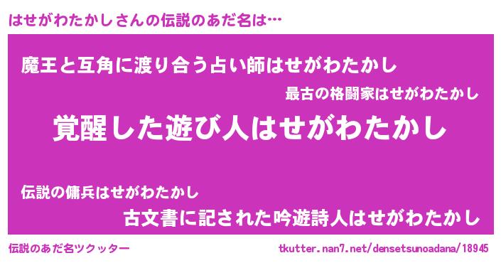 | 男性向けラノベタイトル風あだ名 | 『はせがわたかしに滅ぼされるだけの簡単なお仕事です』 |