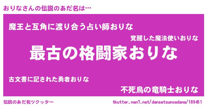 | 男性向けラノベタイトル風あだ名 | 『やはりおりなの青春ラブコメはまちがっている 』 |