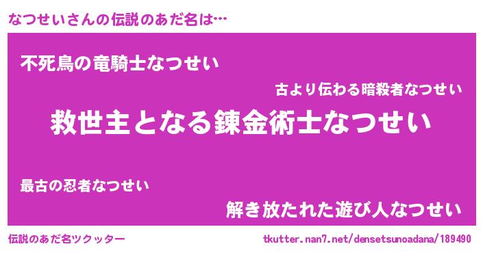 | 男性向けラノベタイトル風あだ名 | 『ノーゲーム・ノーナツセイ』 |
