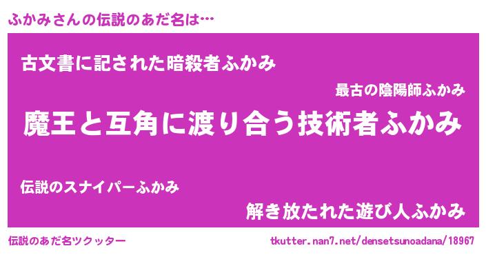 | 女子向けラノベタイトル風あだ名 | 『ふかみ恋絵巻』『ふかみの婚約者』 |
