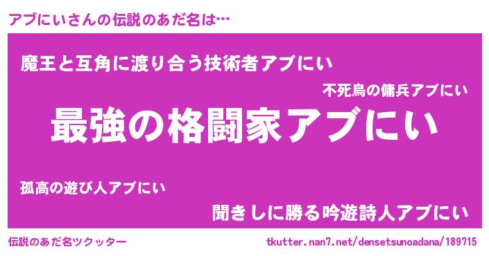 | 意味不明あだ名 | 『アブにいフォーエバー』『自称アブにい』 |