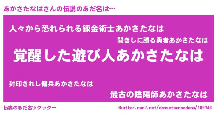 | 男性向けラノベタイトル風あだ名 | 『あかさたなはに滅ぼされるだけの簡単なお仕事です』 |