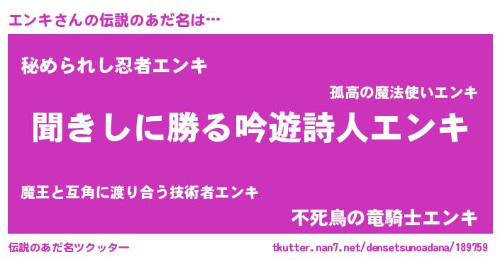 | 男性向けラノベタイトル風あだ名 | 『エンキという概念が存在しない退屈な世界 』 |