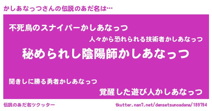 | 意味不明あだ名 | 『自称かしあなっつ』 |