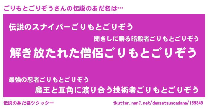 | 男性向けラノベタイトル風あだ名 | 『ごりもとごりぞうに滅ぼされるだけの簡単なお仕事です』 |