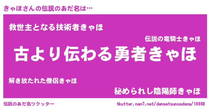 | 男性向けラノベタイトル風あだ名 | 『きゃほという概念が存在しない退屈な世界 』 |