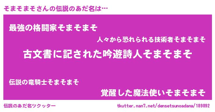 | 胡散臭い通販商品みたいなあだ名 | 『あなたにだけ特別に提供する100年もののヴィンテージワイン…その名も「そまそまそ」』 |