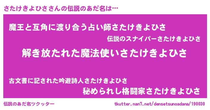 | ポケモン風あだ名 | 『ヒサタケキヨヒサ』『サタゴンZ』 |