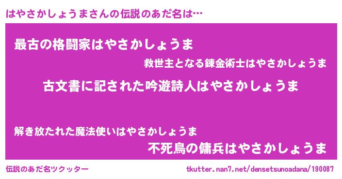 | 男性向けラノベタイトル風あだ名 | 『はやさかしょうま~年齢イコール彼女いない歴の魔法使い~』 |