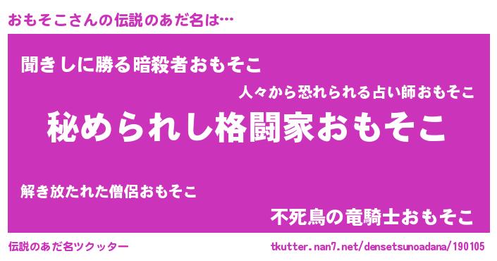 | 男性向けラノベタイトル風あだ名 | 『オモソコスレイヤー』『おもそこの憂鬱』 |