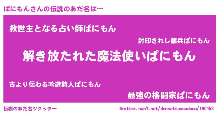 | 男性向けラノベタイトル風あだ名 | 『ダンジョンにぱにもんを求めるのは間違っているだろうか』 |