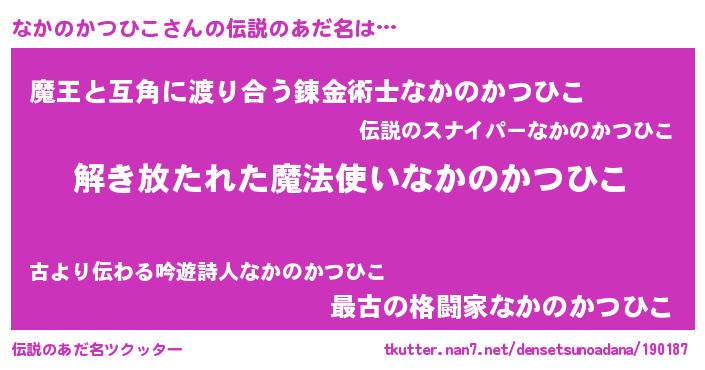 | 男性向けラノベタイトル風あだ名 | 『この素晴らしい世界になかのかつひこを!』 |