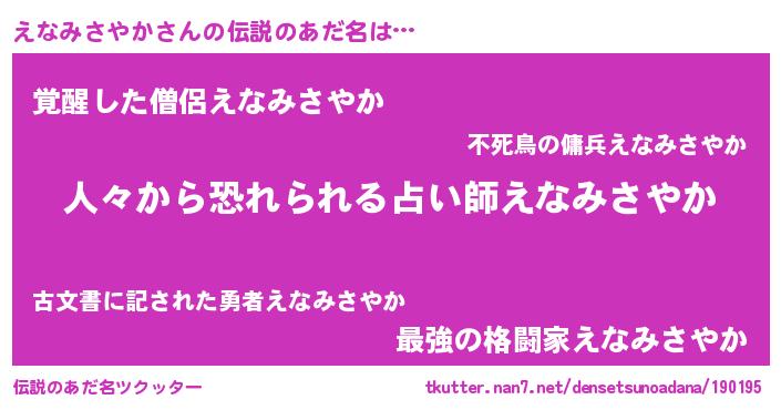 | 胡散臭い通販商品みたいなあだ名 | 『100人中100人が認めたイリジウム磁石…その名も「えなみさやか」』 |