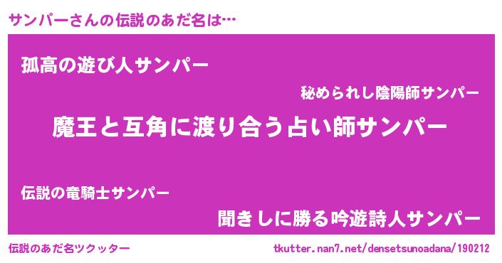 | ヒーロー風カッコイイあだ名 | 『慈愛の使者サンパー』『黄金騎士サン』 |