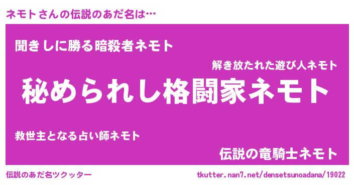 | ファンタジー風あだ名 | 『エターナルネモトー』『ネモディッシュ』 |