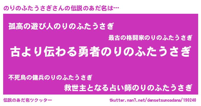 | 男性向けラノベタイトル風あだ名 | 『転生したらのりのふたうさぎだった件』 |