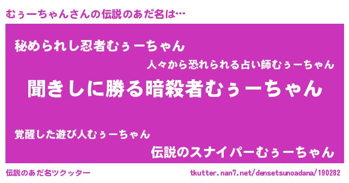 | 胡散臭い通販商品みたいなあだ名 | 『絶対に幸福をもたらす健康食品…その名も「むぅーちゃん」』 |