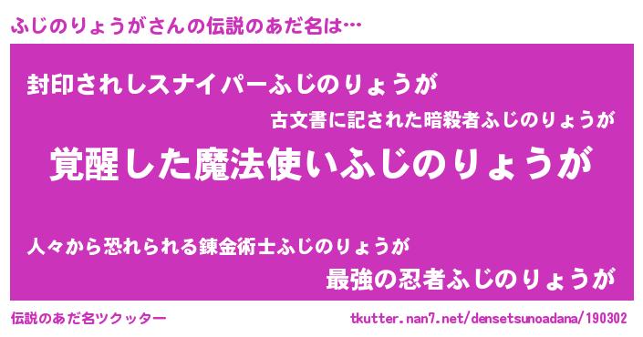 | 男性向けラノベタイトル風あだ名 | 『ふじのりょうがの嫁は女の子じゃないと思った?』 |