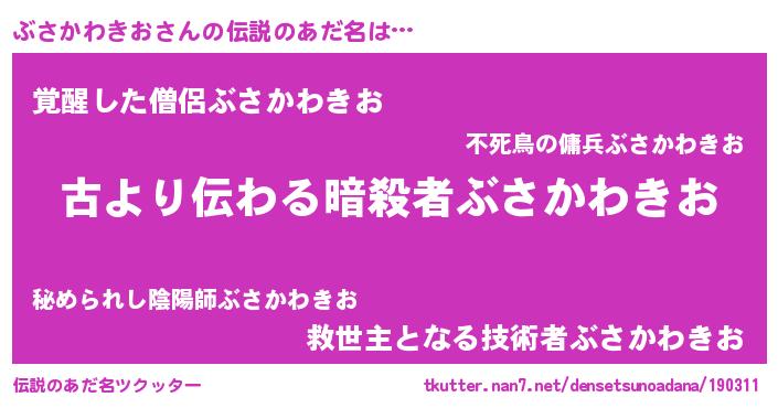 | 男性向けラノベタイトル風あだ名 | 『この素晴らしい世界にぶさかわきおを!』 |