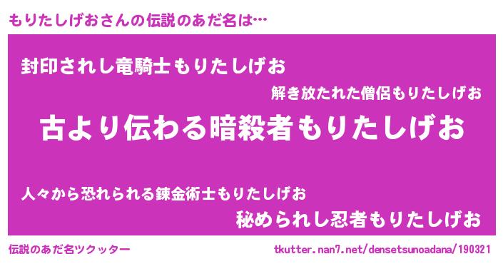| 男性向けラノベタイトル風あだ名 | 『もりたしげおに滅ぼされるだけの簡単なお仕事です』 |