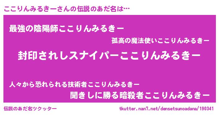 | 男性向けラノベタイトル風あだ名 | 『うちのここりんみるきーが世界を掌握している!』 |