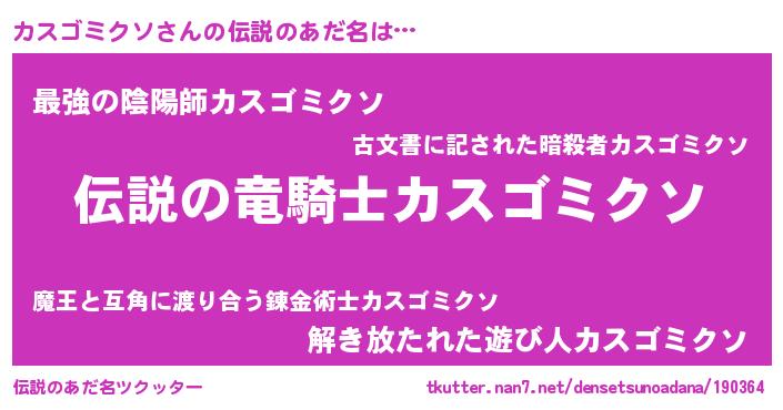| ヒーロー風カッコイイあだ名 | 『スーパーカスゴミクソ』『天弓騎士カス』 |