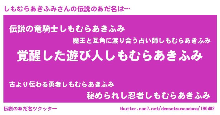 | 意味不明あだ名 | 『とにかく怪しいしもむらあきふみ』 |