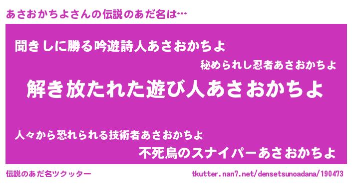| ポケモン風あだ名 | 『ヒアサオカチヨ』『アサセウス』 |