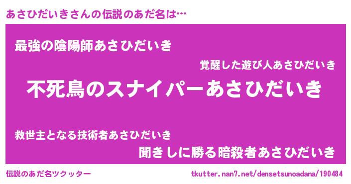| 男性向けラノベタイトル風あだ名 | 『アサヒダイキアートオンライン』 |