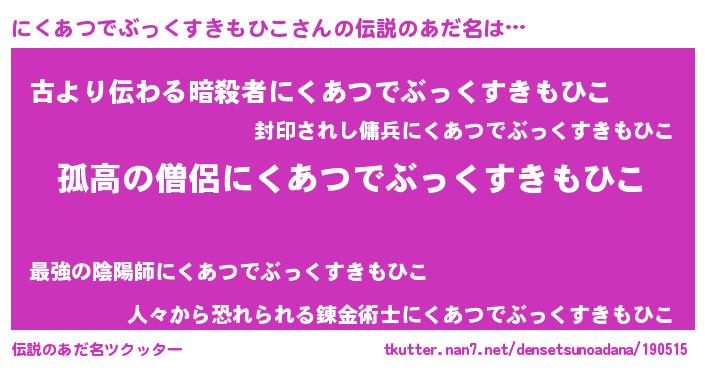 | 意味不明あだ名 | 『住所不定無職にくあつでぶっくすきもひこ(62歳)』 |